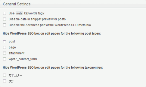 Facebookに関する設定です。いいねボタンなどを設置しているサイトは、「Add OpenGraph meta data」にチェックを入れると良いと思います。