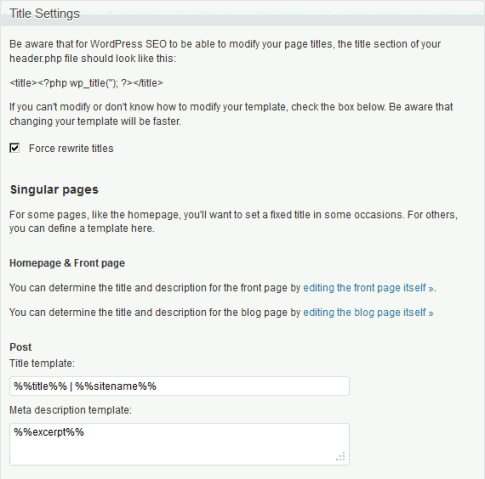 「Force rewrite titles」にチェックを入れると、wp_titleではなく、タイトルタグ内がそのまま設定した内容に差し替わりますので、テーマの関数がよくわからない場合は、チェックしておきましょう。