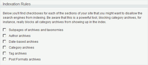 アーカイブの種類ごとに、インデックスさせたくないものにチェックを入れます。これは検索エンジンに、重複記事と思われる危険性を避けるためのものです。